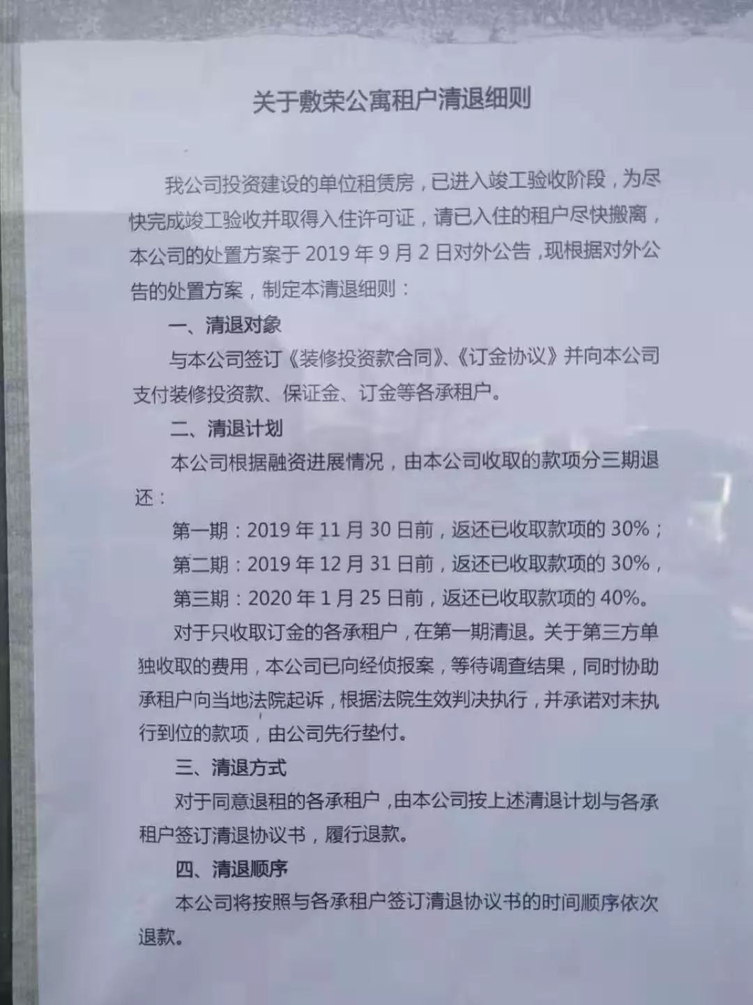 洪先生表示,事发后,开发商始终不主动露面,也不留联系方式。只贴出过一份告示,内容敷衍至极,表示愿意分期退款,但要等到2020年1月25日,才能最终退清全款。