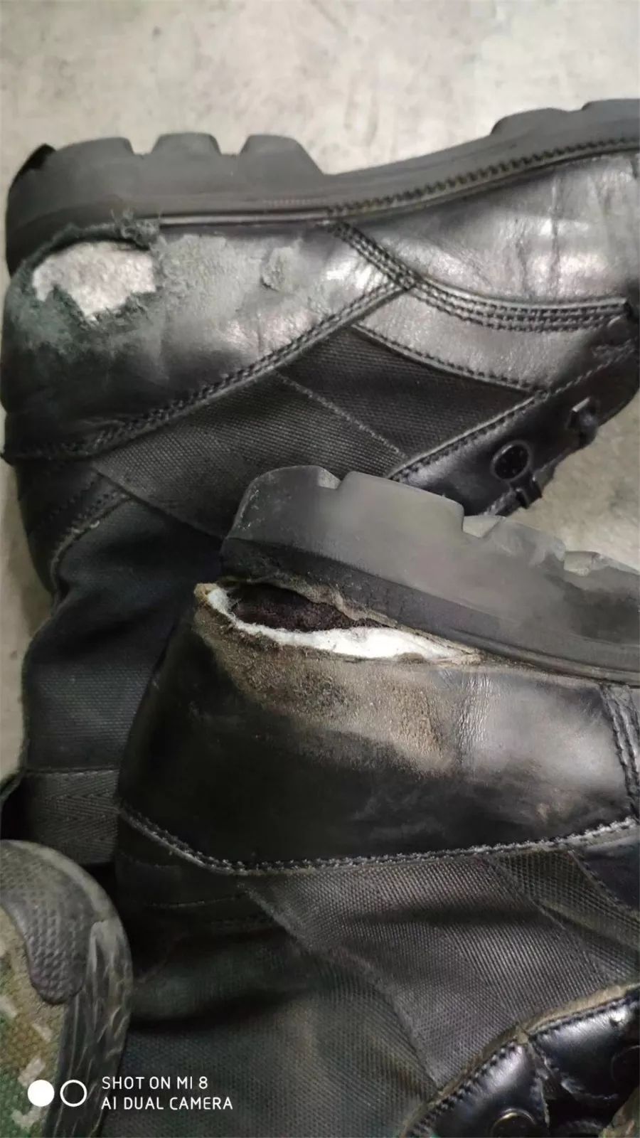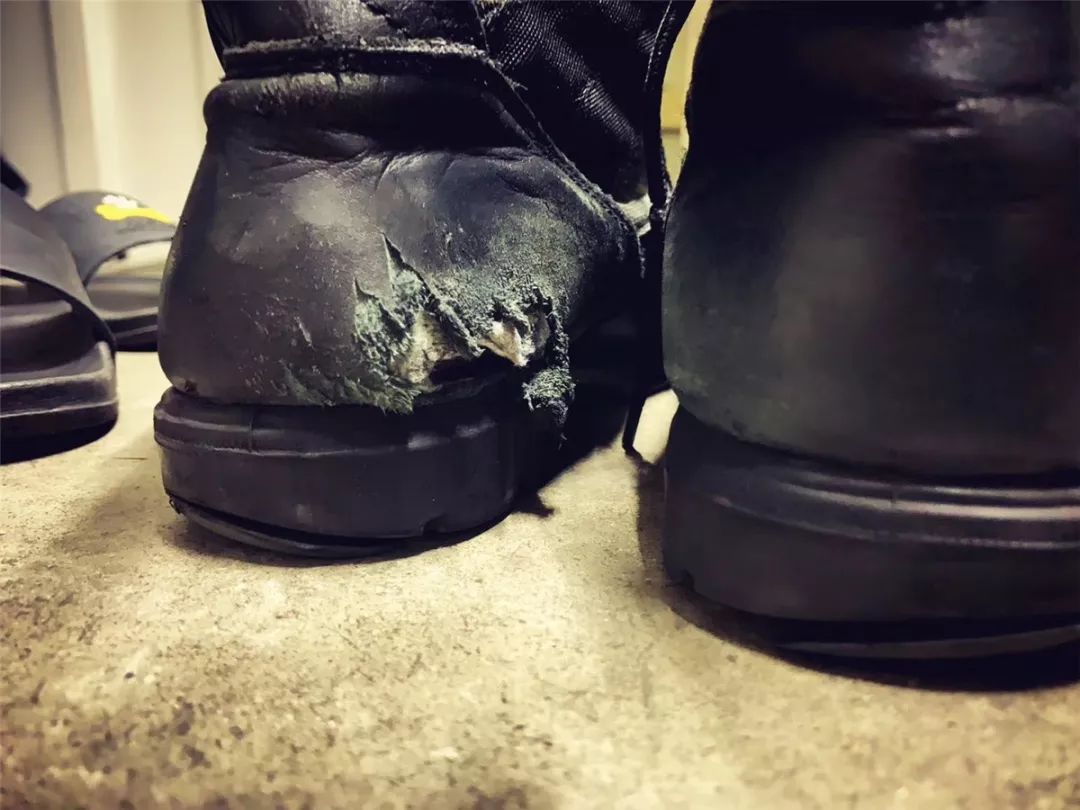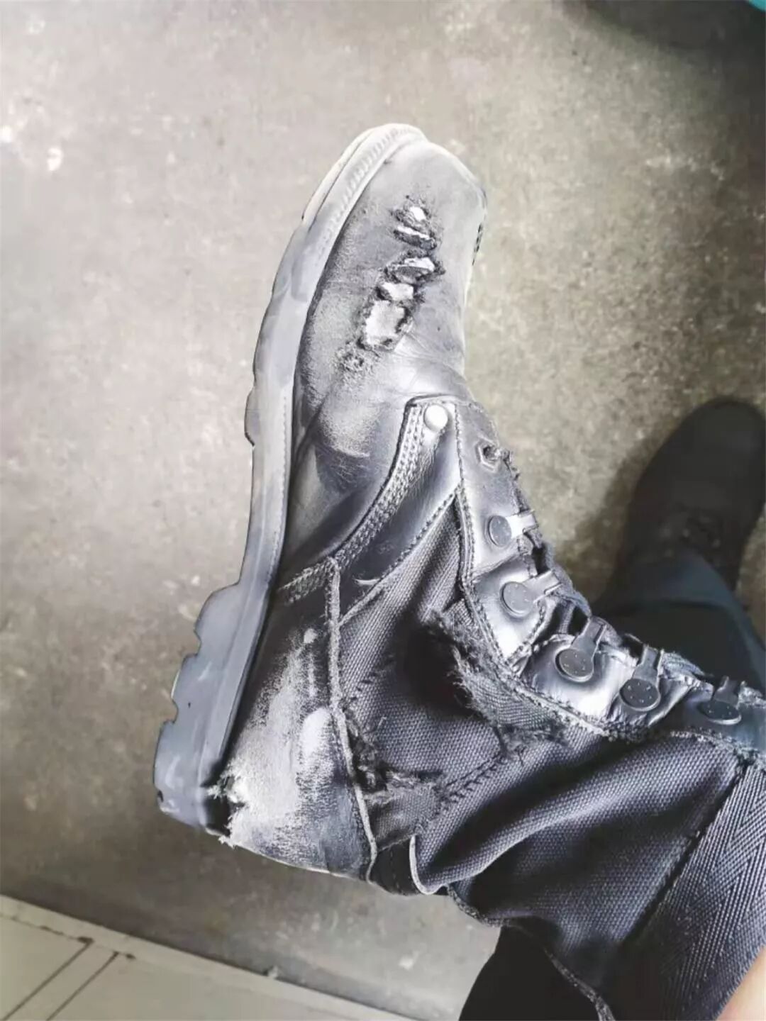 由于长时间多次用脚砸地面,她的靴子早已脱皮开裂了。