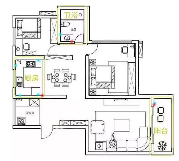 线路要分色。电路有火线、零线、地线之分,三种电线要按照颜色进行区分,一般红色、黄色为火线,蓝色、绿色为零线,黄绿彩线为地线。不分色的电线后期维修很麻烦。(以此类推,水路也是如此。)