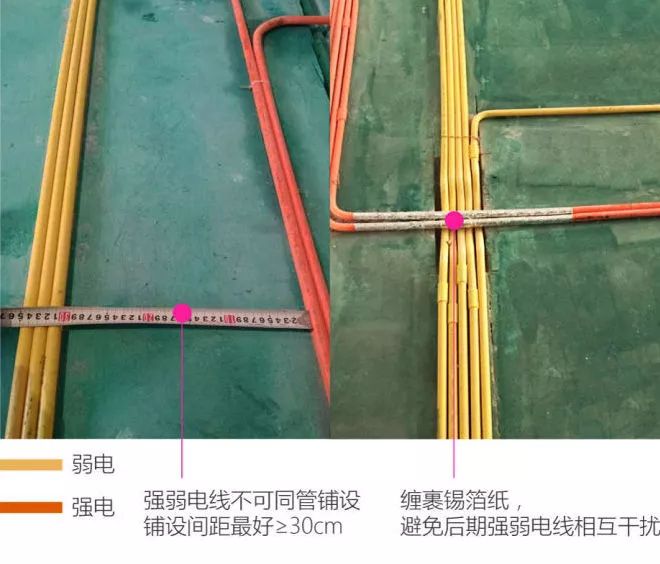 强弱电不能同管。有些工人师傅图省事,会把强电线和弱电线放在一个管内或盒内。这样做会导致:电视经常有雪花,wifi信号也很差。