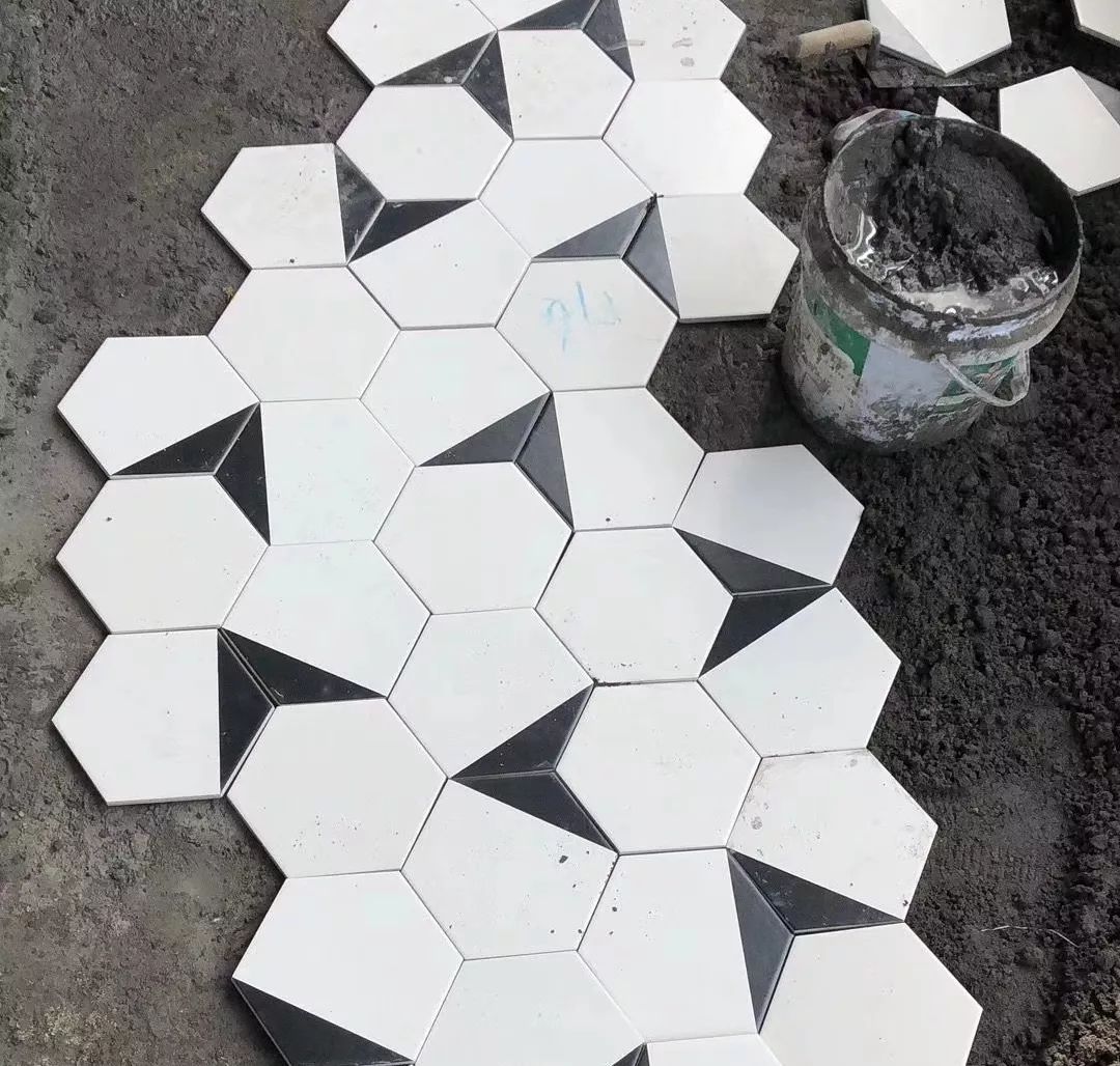▲瓦工贴六角小花砖的小景