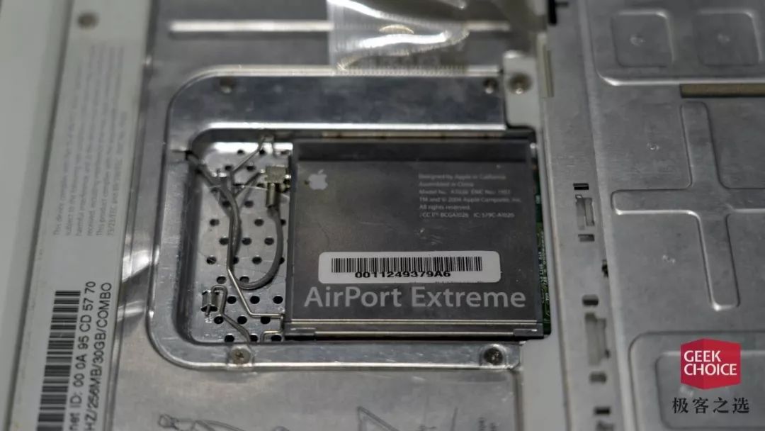 拆下来的键盘与笔记本之间还有一根排线连接,除此之外,你还可以看到苹果为 iBook G4 配备的 AirPort Extreme(无线网卡)。在 iBook 系列出现之前(1999 年),人们上网的主要方式还是靠拨号连接,而苹果的 iBook(系列)第一次将 Wi-Fi 功能(基于 IEEE 802.11 标准)放到了消费级笔记本电脑上。