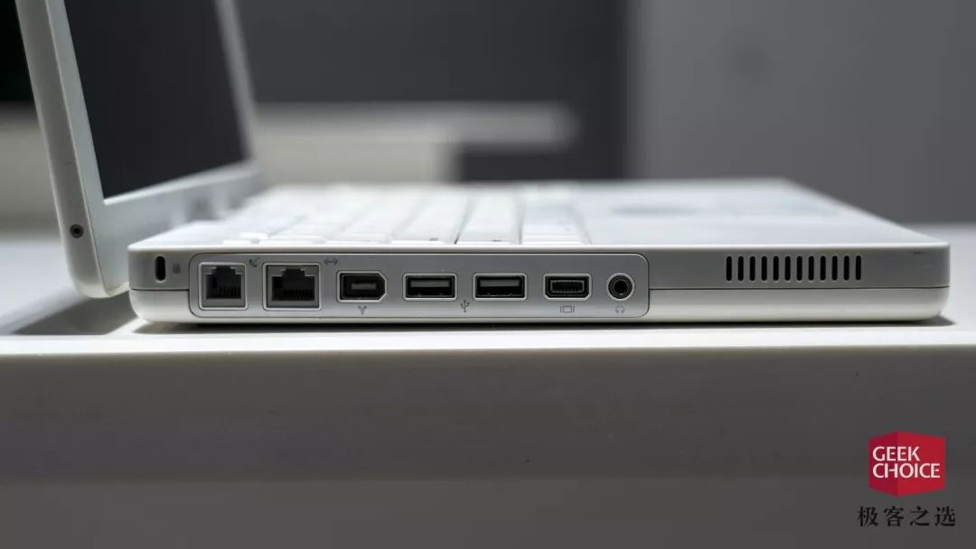 丰富的扩展接口iBook G4 还有一点与现在的 MacBook 不同,那就是丰富的接口支持。笔记本左侧有电话线接口、网线接口、FireWire 火线接口、两个 USB、Mini VGA、3.5mm 耳机接口。当时的火线接口还是很受极客用户欢迎的,这是苹果领导开发的一套接口标准,可以同时供电和进行数据传输,实际速度比 USB 2.0 还要高。不过后来因为专利许可费的纠纷,没有推行开来,后来苹果用 Thunderbolt 雷电接口将其取代。