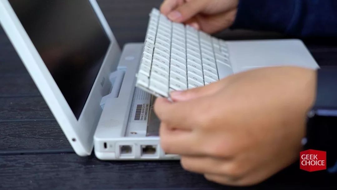 首先要说的是这个可拆卸式的键盘,你只要拧开最上方的锁定开关,然后拨动两个卡扣,就可以轻松地将它拆下。苹果现在卖的妙控键盘和它长得很像,不知道是不是借鉴了这里的设计。