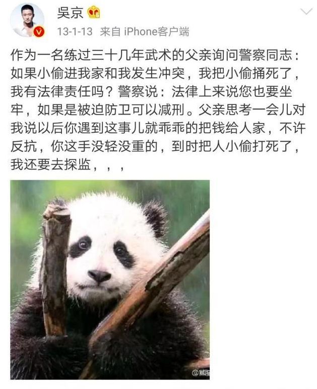 当天,吴京还在微博上称,“作为一名练过三十几年武术的父亲询问警察:如果小偷进我家和我发生冲突,我把小偷捅死了,我有法律责任吗?警察说,法律上来说您也要坐牢,如果是被迫防卫可以减刑。父亲思考一会儿对我说以后你遇到这事儿就乖乖地把钱给人家,不许反抗,你这手没轻没重的,到时把人小偷打死了,我还要去探监……“”