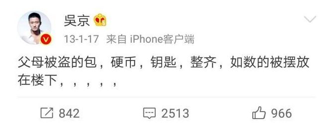 原来,网友拔出了吴京六年前的微博,微博中吴京称自己父母家被盗。
