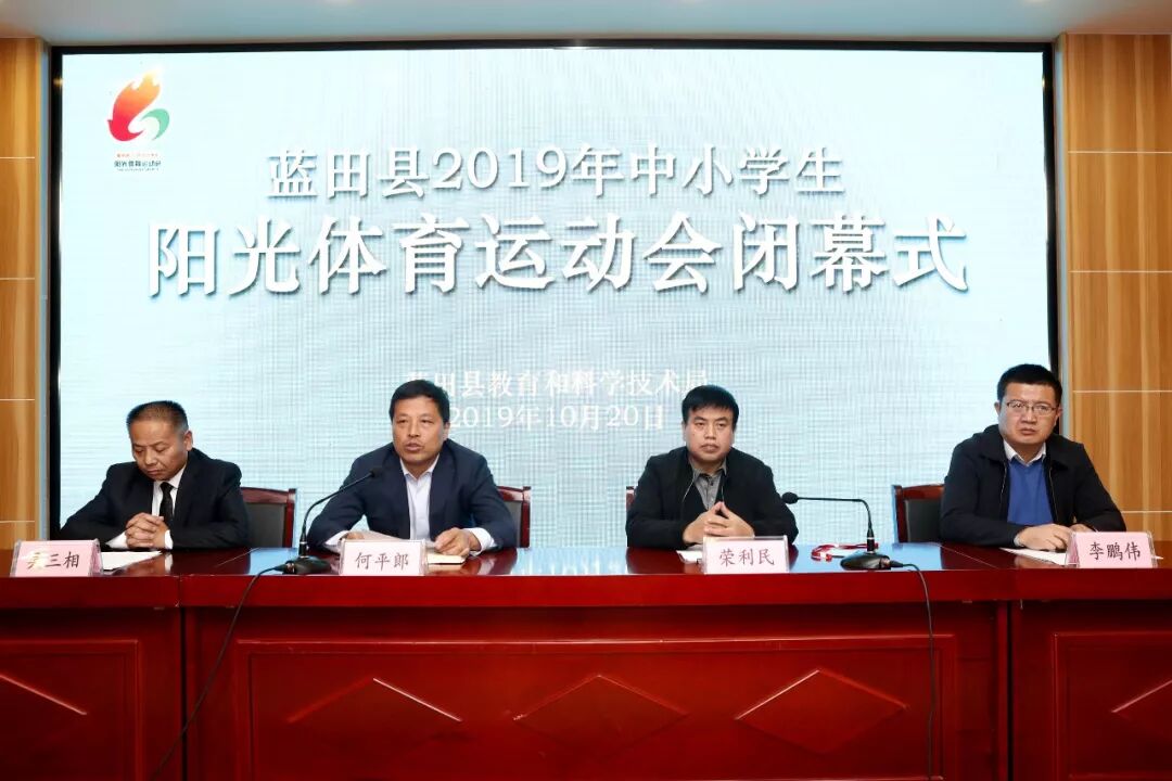 10月20日下午,为期三天的蓝田县2019年中小学生阳光体育运动会完美收官。运动会闭幕式在县职教中心四楼多功能厅举行。县教育和科学技术局党委书记、局长何平郎,副局长荣利民,局党委委员吴三相,县教育扶贫与资助中心主任李鹏伟及各中小学校长等参加了闭幕式。闭幕式由荣利民主持。
