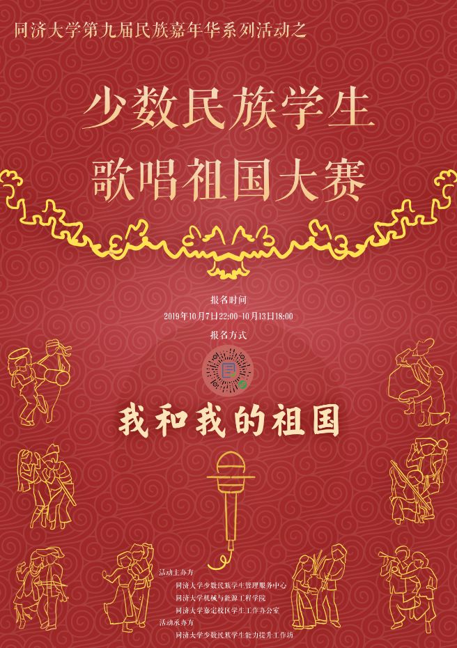 2019年10月15日下午,同济大学第九届民族风采嘉年华系列活动之少数民族学生歌唱祖国大赛初赛分别在四平路校区经纬楼二号楼107室和嘉定校区F楼415-5活动室顺利举行。本次到场的评?委老师有少数民族学生管理服务中心负责人曹雪锋老师、新疆内派教师蔡玲老师及少数民族学生专职辅导员。本次比赛共吸引了36组选手参赛,不论是个人还是组合,他们都用歌声表达了自己对祖国的热爱。
