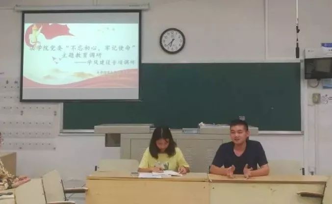 为深入了解学生们的学习和生活,加强学风建设,闽江学院法学院学生第二党支部联合学生会学风督导部于2019年10月15日在教学楼3A102-3教室开展了“不忘初心,牢记使命”主题教育调研座谈会。此次调研会围绕综测细则完善、自习教室管理、课堂督导、学科竞赛、考研考公指导等同学们密切关注学风建设要点展开座谈研讨。法学院各年级班级学委参加此次会议。