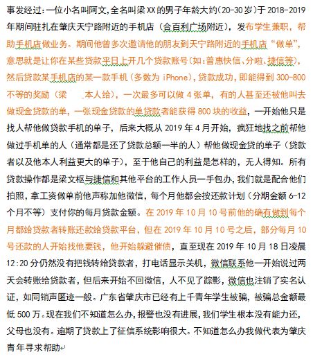 10月4日,肇庆市端州区一名毕业生李某接到自称是金融软件“分期乐”客服的电话,对方能准确说出李某毕业院校、专业和身份证信息,并称其大学期间曾注册“分期乐”账号,现“分期乐”已经下架,额度没有清零,会导致事主学生时期的账号无法注销,会影响事主的个人征信问题。然后以要注销账号,需把贷款额度清空为由,让李某在该软件贷款再全部转到对方提供的银行卡上。之后对方又以无法注销为由不断骗李某在“小米贷款”、“支付宝借呗”、“美团借钱”等其他平台贷款,并转账到对方的银行卡上。受害人李某共计损失三万多元。