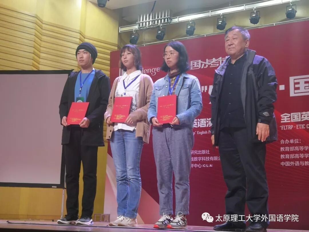 外研社·国才杯”全国英语演讲、写作和阅读大赛(山西赛区复赛)在山西大学举行。此项大赛是由外语教学与研究出版社主办,教育部高等学校大学外语教学指导委员会和教育部高等学校英语专业教学指导分委员会合办。来自太原理工大学、山西大学、中北大学和山西师范大学等全省30多所高校、140余名选手同台竞技,参加了阅读、写作、演讲三大赛事的比赛。经过激烈的角逐,我校选手电科1701班王敏学获阅读比赛特等奖,英俄1901班暴慕岩获得写作大赛一等奖,英语1601班郭文杰获得阅读二等奖,英日1701班武一帆和通信1701班王昱彪获得演讲比赛二等奖,环工1601班陶悦馨获得写作大赛三等奖,取得了优异战绩。