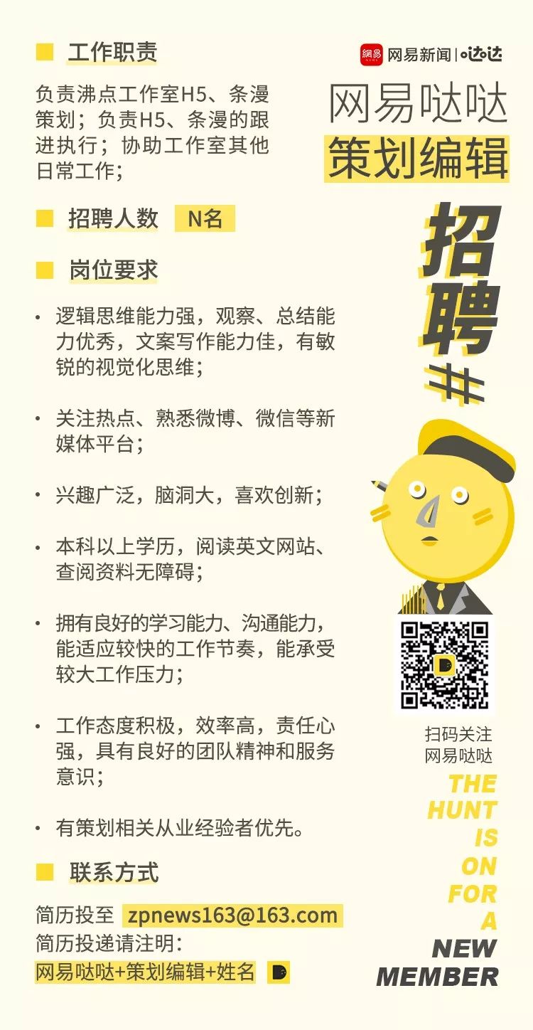 网易哒哒,一个专注生产有趣、好玩内容的策划团队,内容产出包括互动H5,有意思的创意漫画等。一个能让你无限开阔脑洞,也能让你快速成长的团队。