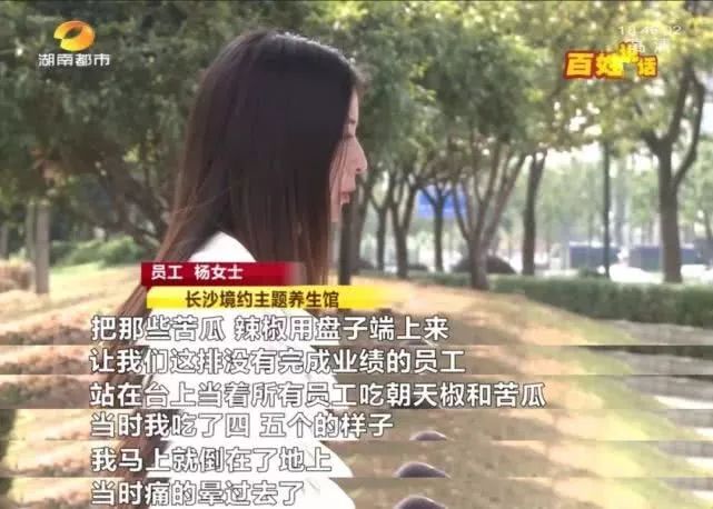 上月底,湖南长沙一养生馆SPA组的杨女士,因当月业绩未达公司制定标准,整组被惩罚生吃朝天椒及苦瓜。生吃4个朝天椒后,杨女士胃部出现不适并晕倒被救治。在家休养期间,她被踢出公司工作群,工牌、工号被撤换。目前,经协商,公司已支付杨女士所有医药费。(湖南都市)