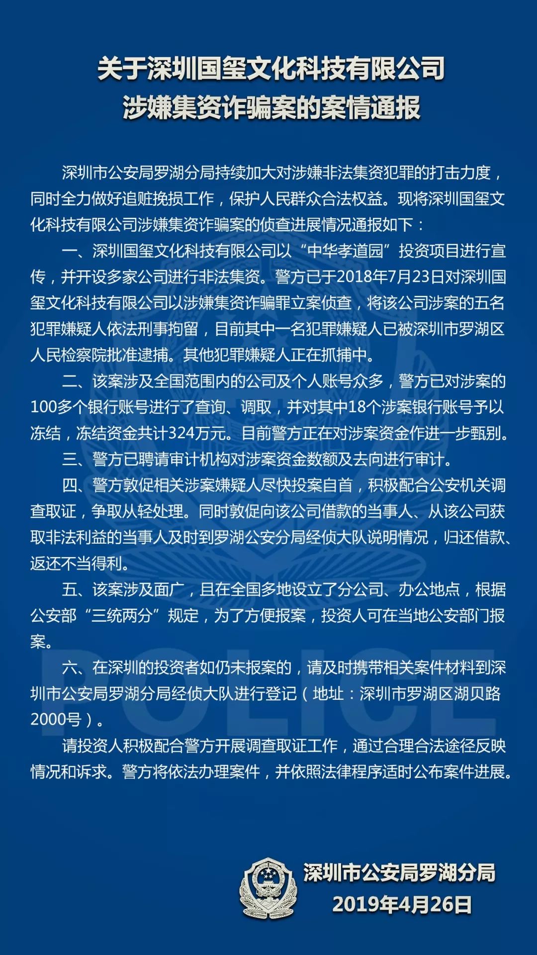 4月26日,罗湖公安发布一则消息《关于深圳市国玺文化科技有限公司涉嫌集资诈骗案的案情通报》,内容显示对“中华孝道园”5名犯罪嫌疑人依法刑拘,其他犯罪嫌疑人正在抓捕中。