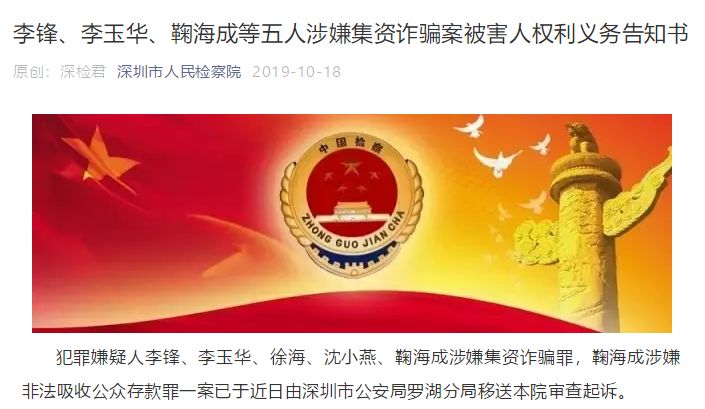 点击蓝字关注我们关于“中华孝道园”案最新进展来了:犯罪嫌疑人李锋、李玉华、沈小燕、徐海、鞠海成等五人被深圳市人民检察院审查起诉!