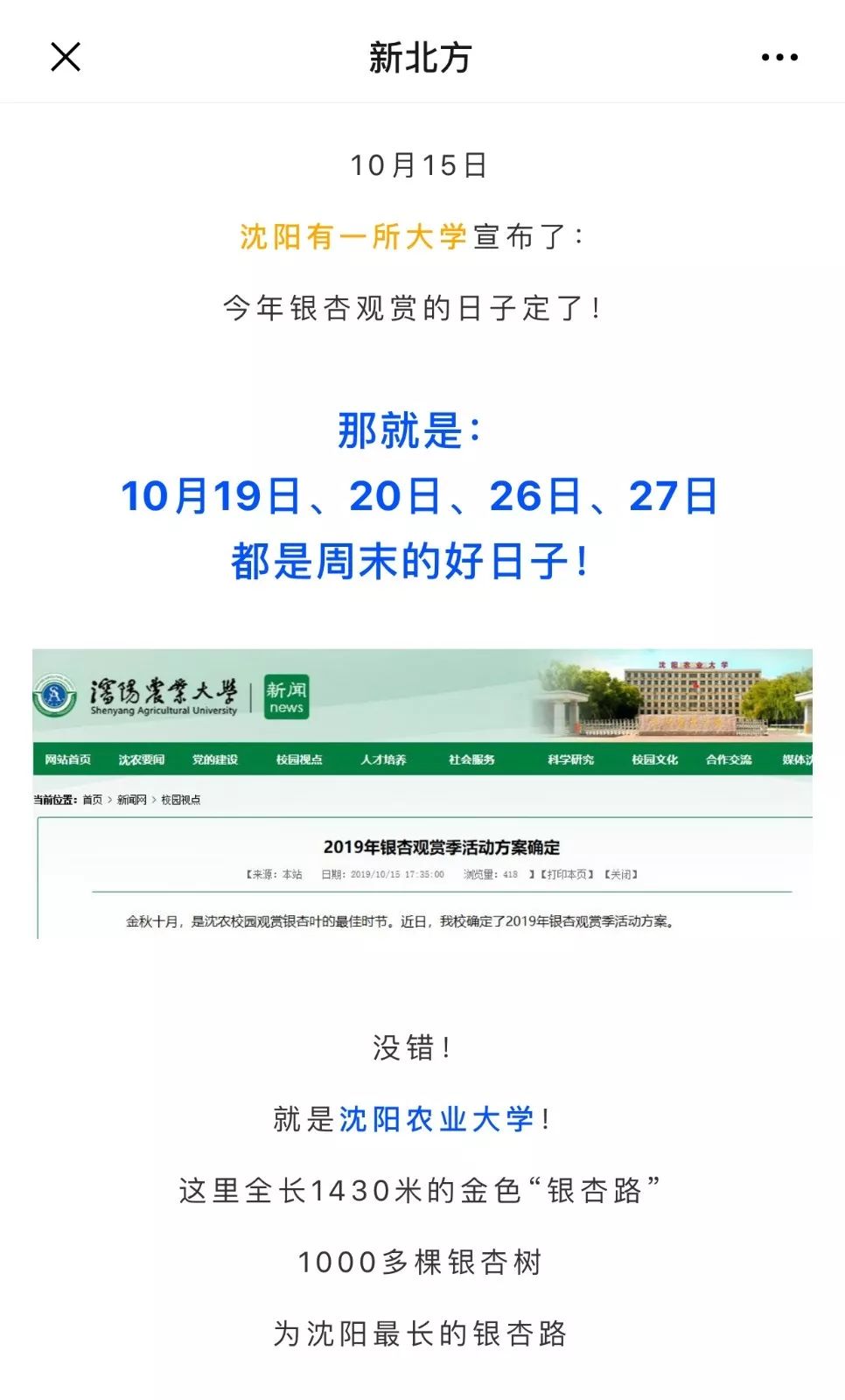2019年沈阳农业大学银杏观赏季·大学生创新创业项目成果展的对外开放时间为10月19日、20日、26日、27日。