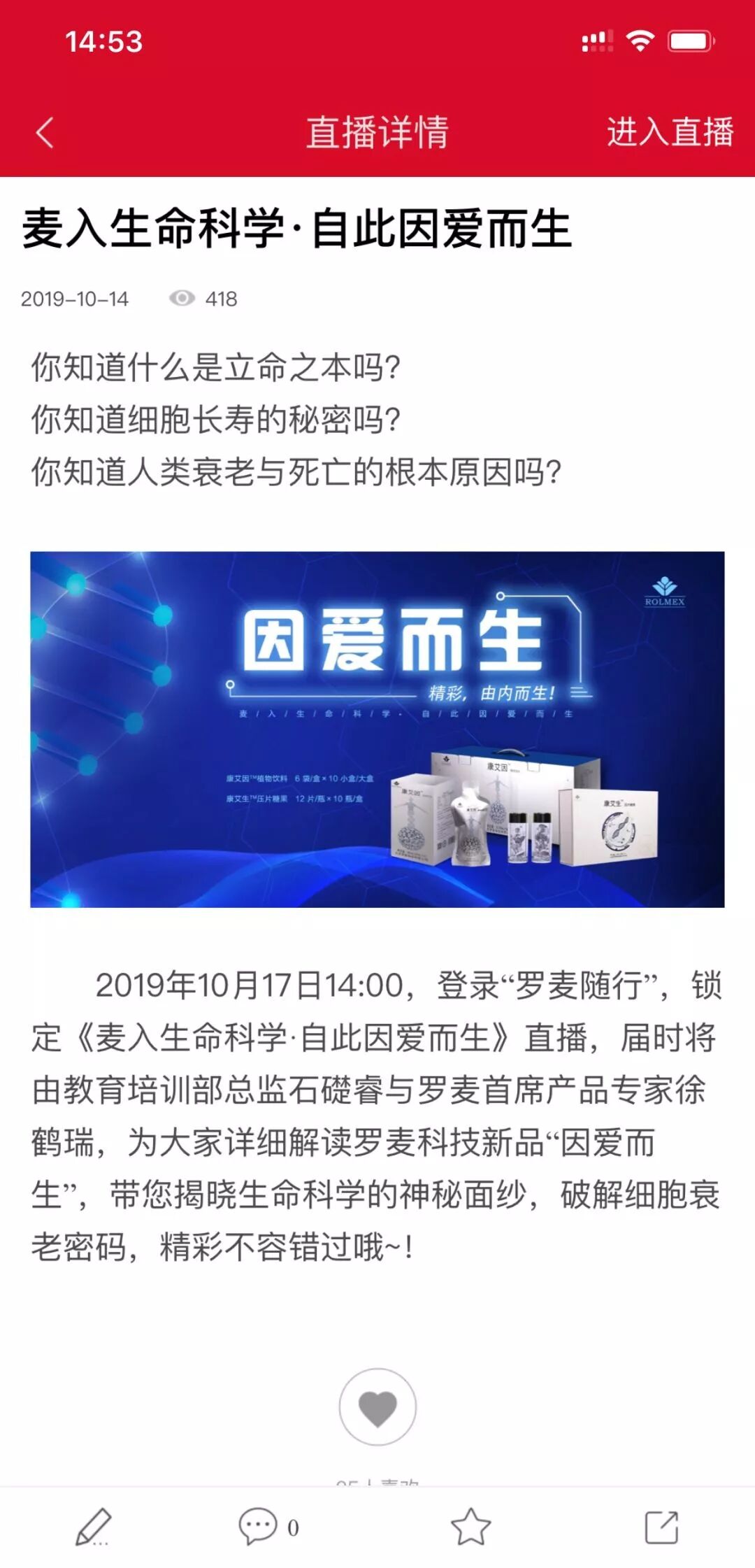 2019年10月17日14:00,登录“罗麦随行”,锁定《麦入生命科学·自此因爱而生》直播,届时将由教育培训部总监石礎睿与罗麦首席产品专家徐鹤瑞,为大家详细解读罗麦科技新品“因爱而生”,带您揭晓生命科学的神秘面纱,破解细胞衰老密码,精彩不容错过哦~!