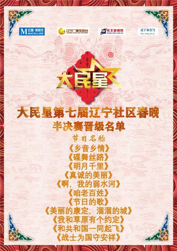 2019年10月20日,由辽宁广播电视台、东北新闻网、红星美凯龙和沈阳歌华传媒联合录制的大民星第七届辽宁社区春晚沈阳赛区半决赛第一场,在红星美凯龙沈阳沈北商场隆重举行。这一场半决赛,我们迎来了本届辽宁社区春晚沈阳赛区开赛以来的第一波高潮,在之前三场海选赛中成功晋级的优秀选手、演员团队荣归舞台。面对要求更高、更为艰巨的困难与挑战,他们纷纷使出浑身解数、倾尽全身力气,为进军沈阳赛区决赛、上半程赛事圆满收官,放手一搏、不负期待!那么,究竟有哪些优秀节目,最终在本场比赛中脱颖而出、成功晋级,挺进沈阳赛区决赛?现在,大民星第七届辽宁社区春晚沈阳赛区半决赛第一场晋级名单,为您揭晓——
