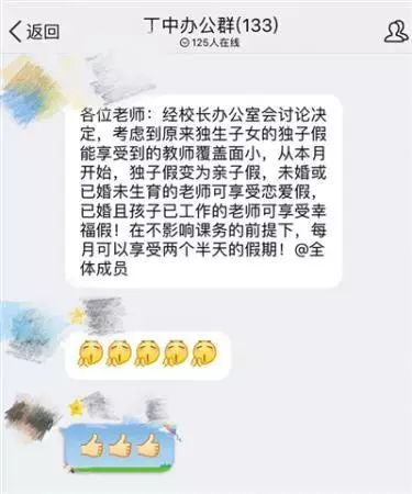 该校除了针对青年教师新推出的“恋爱假”,还有针对有子女教师的“亲子假”,及面向年长教师群体设立的“幸福假”。