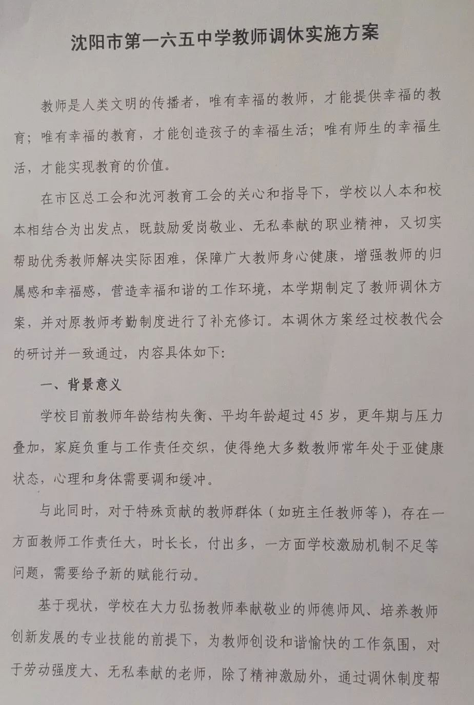 10月11日辽宁省沈阳市第一六五中学制定了教师调休方案让教师享受“孝亲假”“亲子假”“恋爱假”↓↓