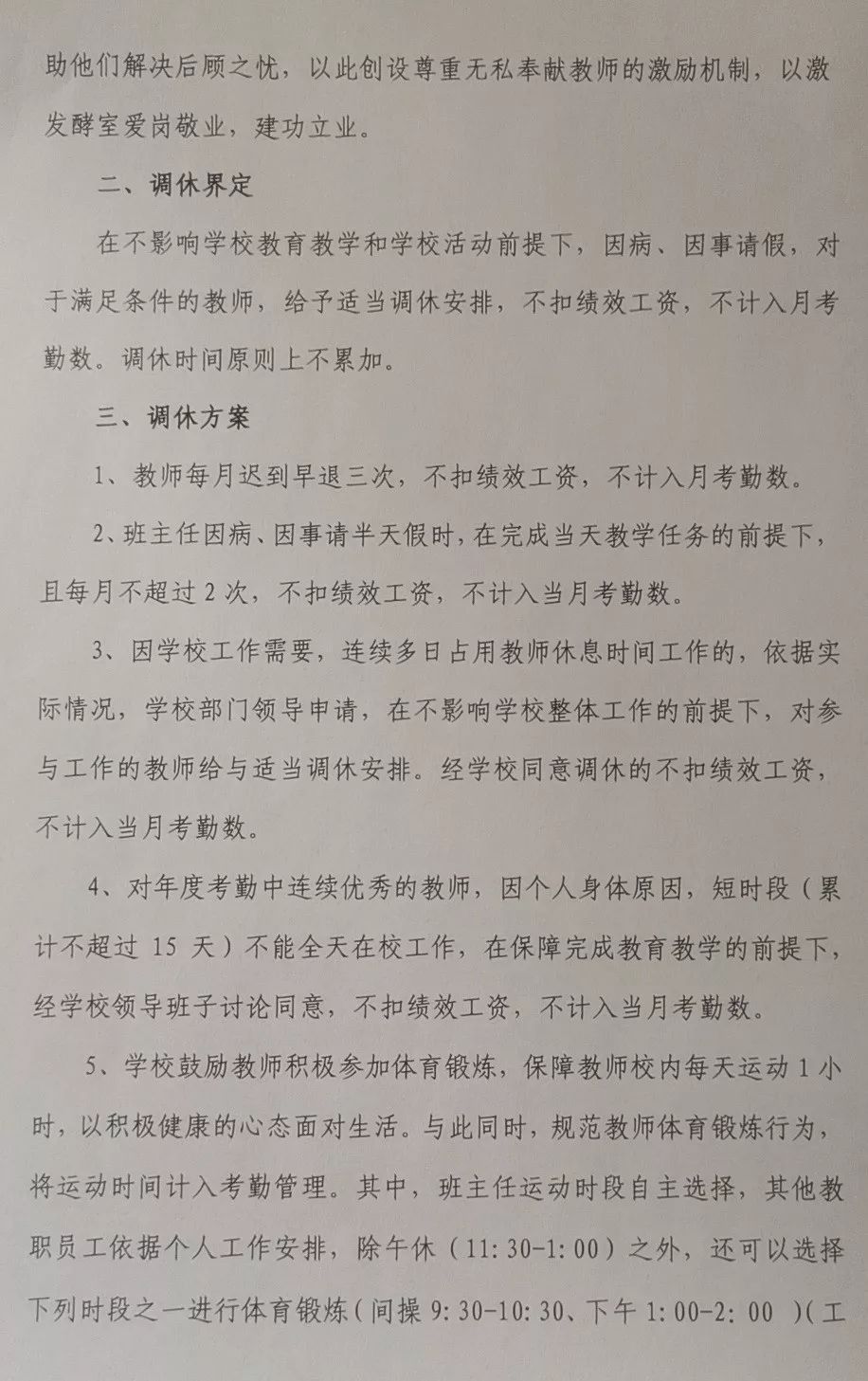 教职工每月迟到早退三次,不扣绩效工资,不计入月考勤数;班主任因病、因事请半天假时,在完成当天教学任务的前提下,且每月不超过2次,不扣绩效工资,不计入当月考勤数;因学校工作需要,连续多日占用教师休息时间工作的,依据实际情况,给予适当调休安排……