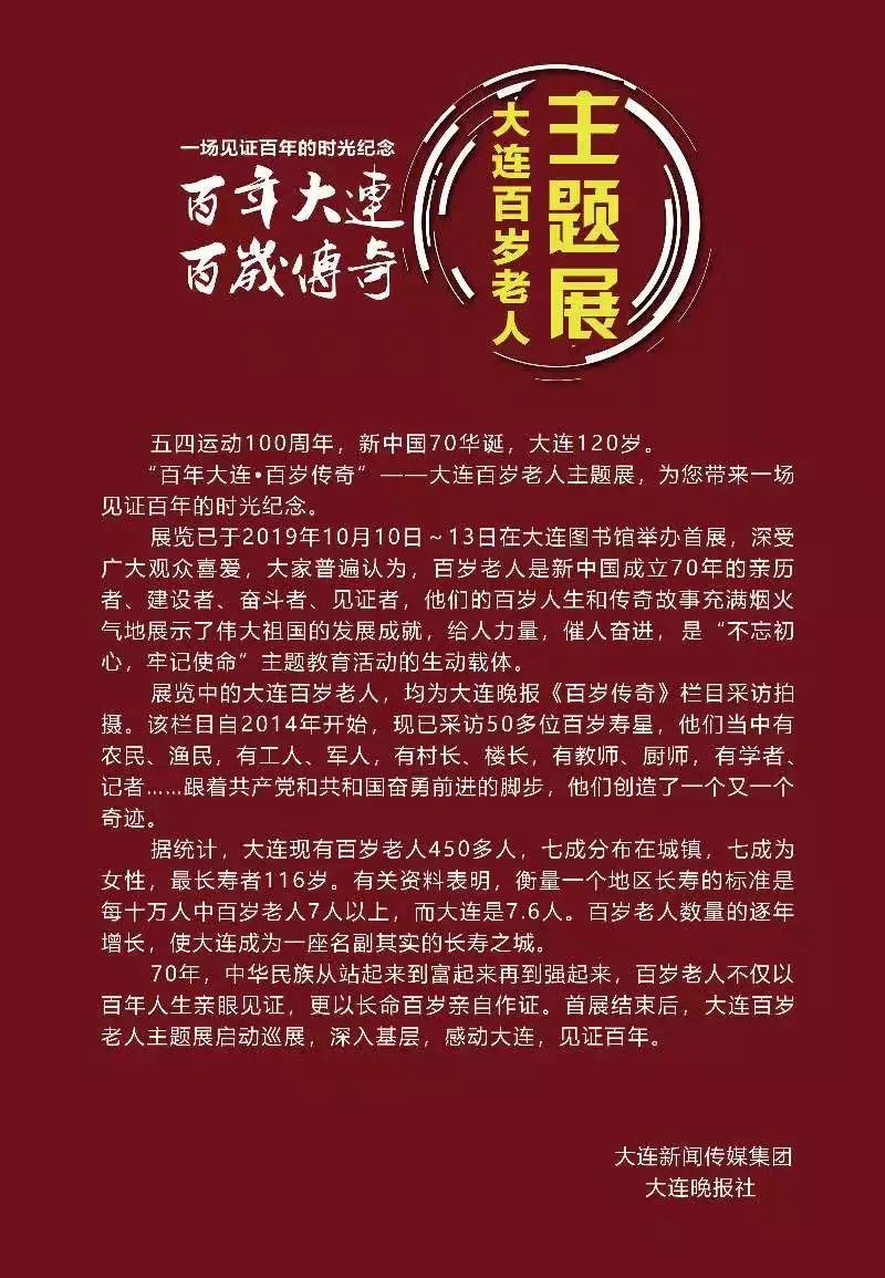 2019年10月19日,“百年大连?百岁传奇”——大连百岁老人主题展公益巡展正式启动,首站走进大连慈善颐养院。