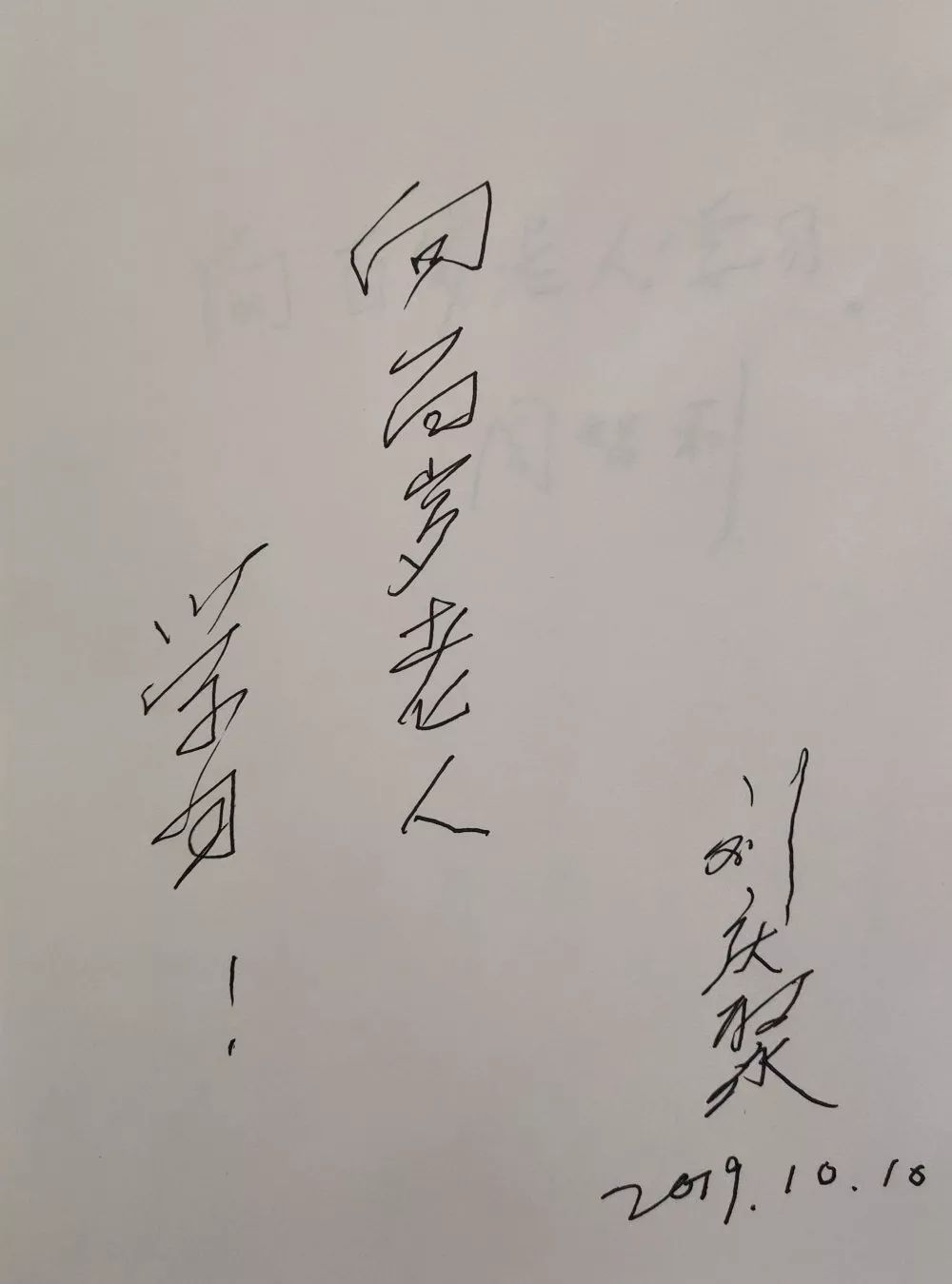 老人用颤抖的手在留言簿上写下“向百岁老人学习”7个字。