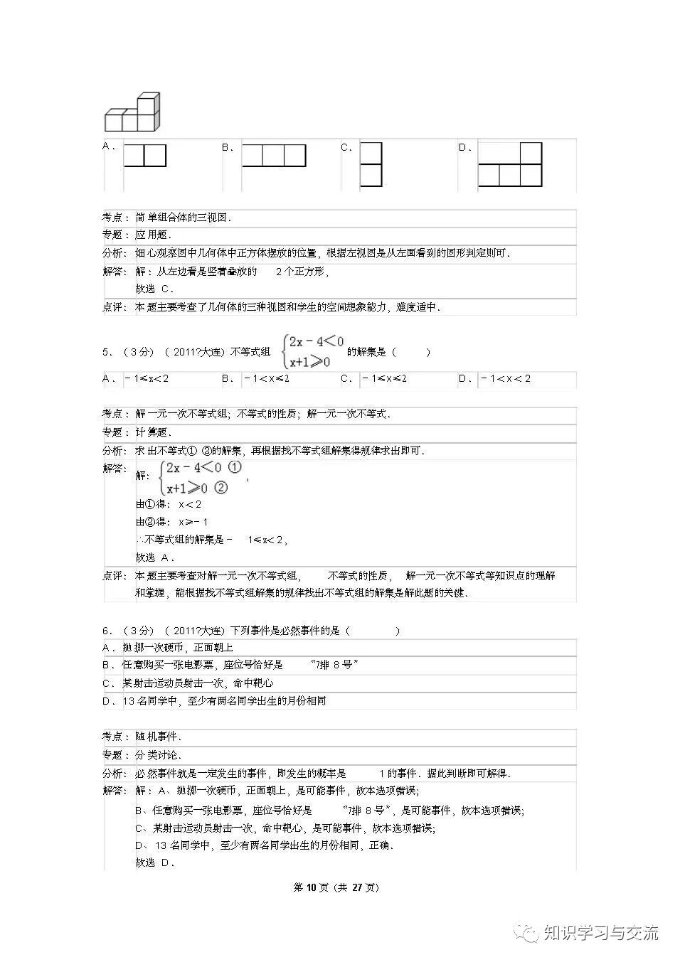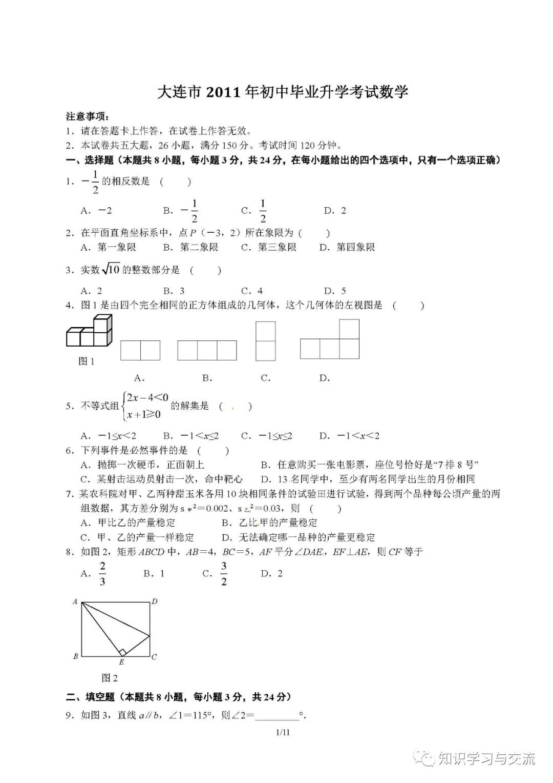 2011 年大连市初中毕业升学统一考试数学(中考数学,含参考答案与评分标准)