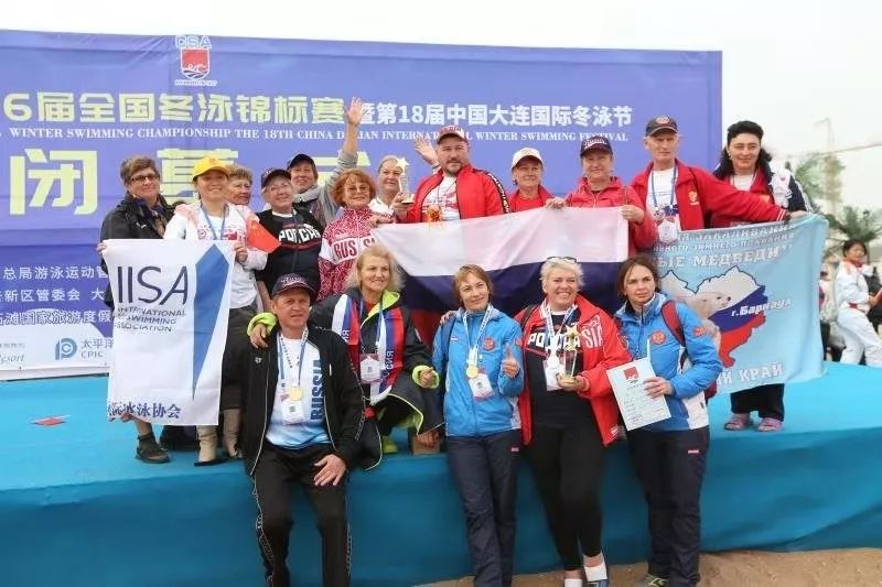 俄罗斯的冬泳爱好者在闭幕式现场合影留念