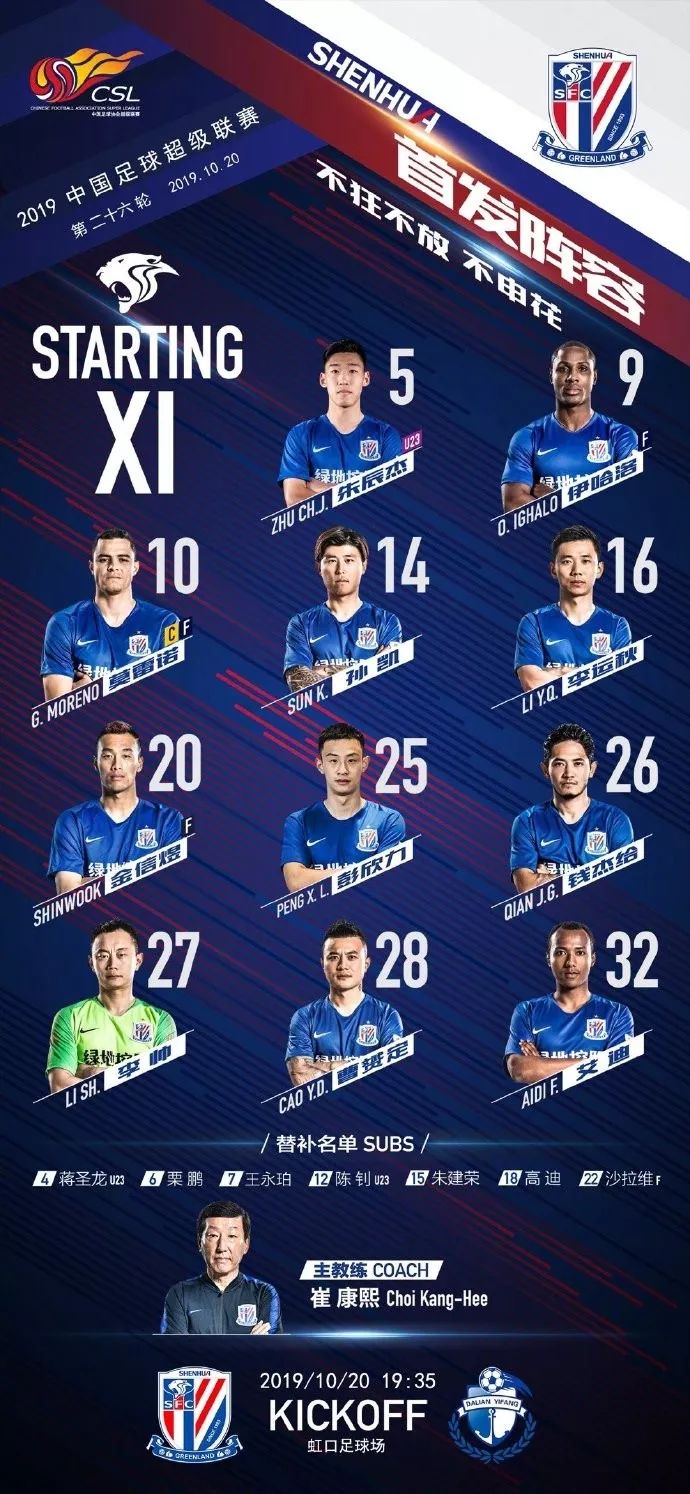 北京时间10月20日19:35,2019中超联赛第26轮上海绿地申花坐镇主场虹口足球场迎战大连一方。