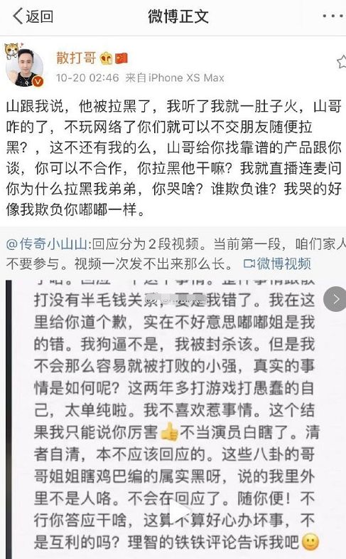 随后散打哥发文嘟嘟姐碰瓷 没好果子吃。原文:看完聊天记录我真的哭笑不得,要道歉也是她道歉,山哥没错,我也没错,我都不知道你哭啥?难道就是拉黑山哥碰瓷我?也不能啊,碰瓷我的基本上没好果子吃的,真搞不懂,嘟嘟脑子想啥了?