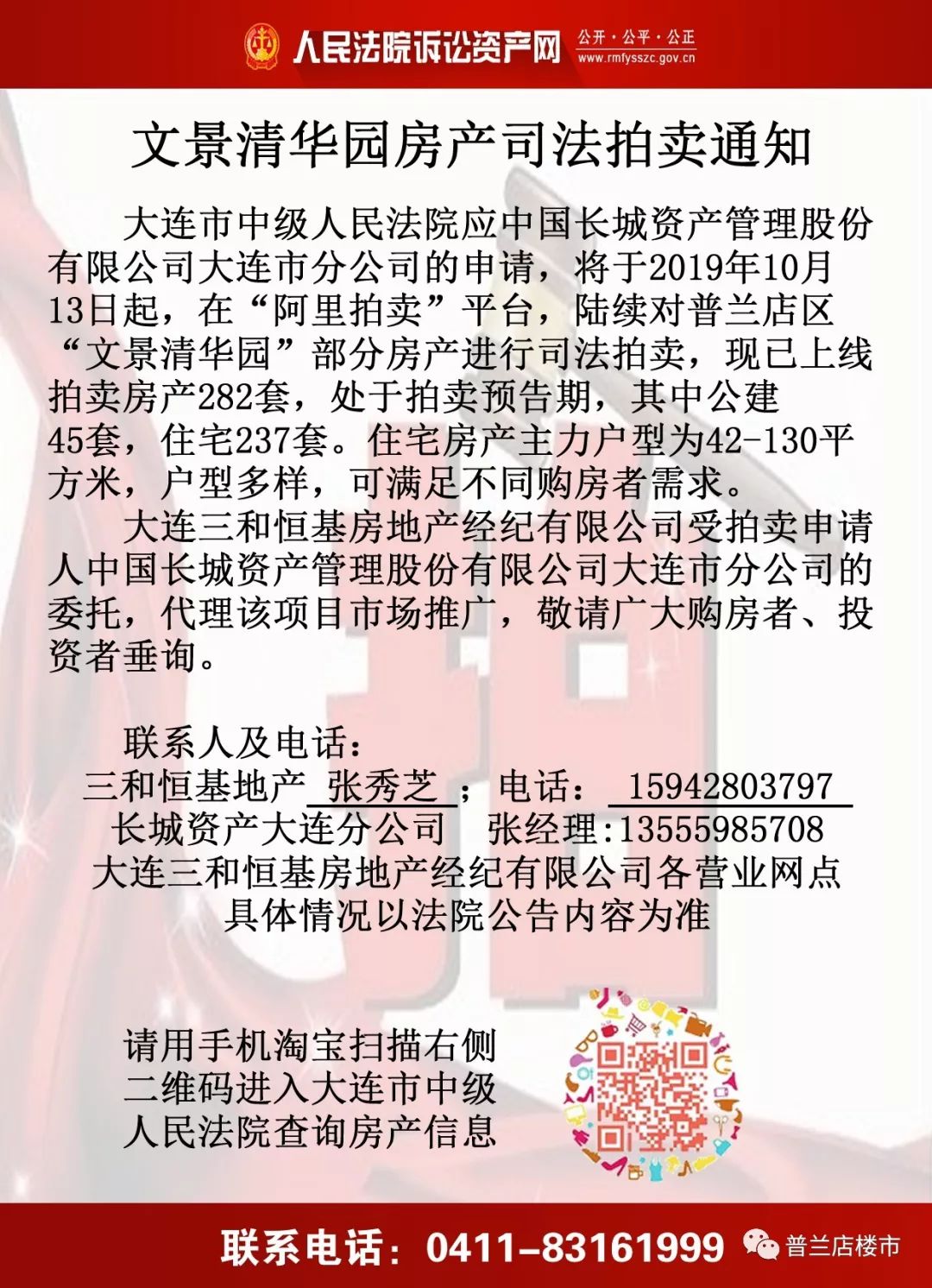 大连市中级人民法院应中国长城资产管理股份有限公司大连市分公司的申请,将于2019年10月13日起,在“阿里拍卖”平台,陆续对普兰店区“文景清华园”部分房产进行司法拍卖,现已上线拍卖房产282套,处于拍卖预告期,其中公建45套,住宅237套。住宅房产主力户型为42-130平方米,户型多样,可满足不同购房者需求。