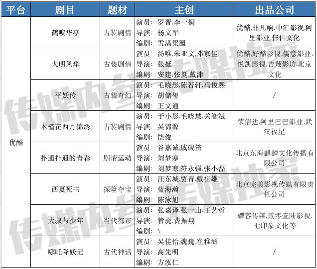 第一,待播独播剧目储备量大,承袭“硬汉风”。相对于其他网络平台,优酷在第四季度的待播独播剧目数量最多,涉及题材也较为广泛。并且从整体气质上说,无论是都市题材剧《大叔与少年》、古代题材剧《鹤唳华亭》《哪吒降妖记》,还是悬疑冒险题材剧《西夏死书》,均承袭了优酷以往的硬汉风格。