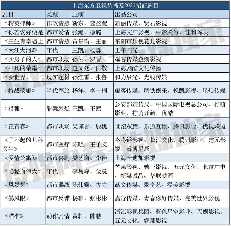 第一,依旧走“都市”风格,行业剧成主要亮点。在东方卫视的片单中,都市题材剧占比71%,成为绝对主导。不仅有靳东、蓝盈盈主演的都市律政剧《精英律师》,张翰、徐璐主演的都市爱情剧《你若安好便是晴天》,还有娄艺潇、李佳航主演的系列都市喜剧《爱情公寓5》等等。值得一提的是,在都市题材作品中,行业剧或职场剧成为主要亮点,聚焦律师、医生、房产销售、美容销售等职业,通过小人物在职场生活的成长展现行业魅力或行业发展。从目前透露出的信息来看,此类剧集极容易形成破圈话题,以此吸引更多受众群体。