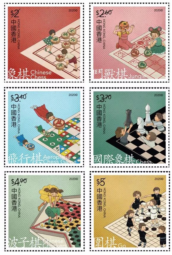 棋艺能够训练人集中和专注,变化多端的棋局能引发思考想像,棋盘上的胜负得失更能激发应付逆境的能力,让孩子学懂应对学业及生活上各种挑战。奕棋更是亲子活动的益智之选,一家大小一起动动脑筋之馀又可纾缓压力。香港邮政发行以「棋乐无穷」为题的儿童邮票,以大众化的象棋、斗兽棋、飞行棋、国际象棋、波子棋及围棋设计一套六枚邮票,颜色鲜明夺目的小全张上六枚邮票附有不同形状的齿孔,实为不可多得的邮品!