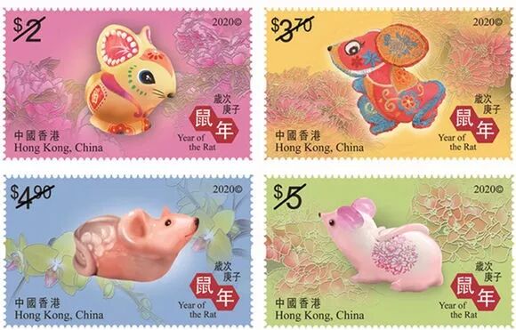 岁次庚子(鼠年)邮票是香港邮政贺岁生肖邮票第四辑的第九套。一套四款的邮票分别以泥塑、刺绣、陶瓷及玻璃工艺品作主题,尽显巧鼠机智、灵动和聪敏的天性,带出巧鼠贺岁的主题,同时亦会推出邮票小型张及丝绸邮票小型张,为新春佳节增添喜庆祥和,共迎万事大吉的新一年。