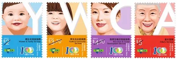 香港基督教女青年会(女青)于1920年成立,属本港首个以妇女为主要服务对象的非政府机构。时至今日,女青已发展成一个综合社会服务机构,为市民提供以人为本的多元化社会服务。2020年适逢女青成立100周年,香港邮政发行一套四枚邮票以誌纪念。邮票以不同年龄层女性的图画展示女青四项主要服务,包括妇女及家庭服务、青年及社区服务、教育及就业服务和耆年服务。