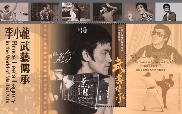 李小龙是享誉全球的传奇武术家,也是电影及武艺文化界的表表者,成就跨越地域、时代和界别。李小龙出生于美国三藩市,在香港成长,曾是电影童星,其后负笈美国,并在当地开设武馆授徒,融哲于武,更以演员身份逐渐扬名于影艺圈及武术界,蜚声中外。纵然李小龙离世至今已逾四十载,但他的形象和武艺仍传承于世。香港邮政以李小龙的四部电影︰《唐山大兄》、《精武门》、《勐龙过江》、《死亡游戏》、他的哲学思想及他一手创立的「截拳道」作灵感,设计一套六枚邮票及邮票小型张,向这位经典人物致敬。