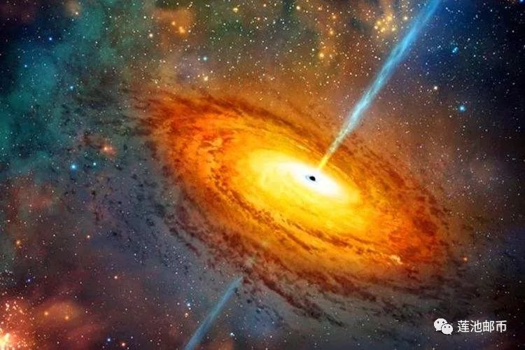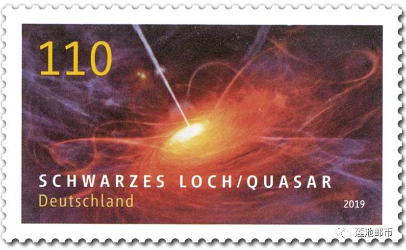 德国于2019年7月1日发行天体物理学系列邮票:第二枚为黑洞(类星体)邮票,面值1.1欧元。描绘了在吸积盘中心物质掉入黑洞,伴随着巨大的能量辐射,形成的物质喷流。