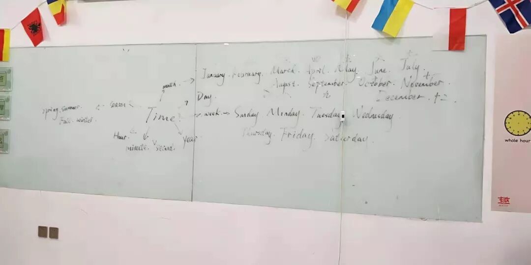 这节课讲了怎么让孩子表达时间(TIME),可以用年份(year)、季节(season)、月份(month)、星期(week)、日期(day)、小时(hour)、分钟(minute)、秒(second)等