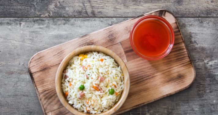 找一个大小合适的碗,放入半碗米和小半碗水,再放入适量的酱油和芝麻油,还可以把培根切成小块放进去。