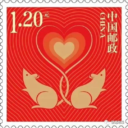 信卡邮资图及画面图案围绕生肖鼠、“心”型扩散纹样为底纹,搭配红色基调,寓意新年喜庆热烈。