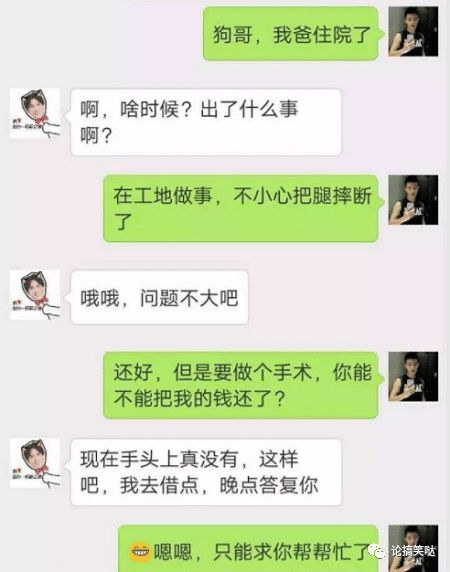 嘟嘟的搞笑聊天记录:老爸:儿啊,你饿不? 我:饿 老爸:那你起床给咱买饭去。 我:。。。。。 无奈去买了。 次日。。。 老爸:儿啊,你饿不? 我:想了想,不饿 老爸:那爸饿了,你给爸买饭去。