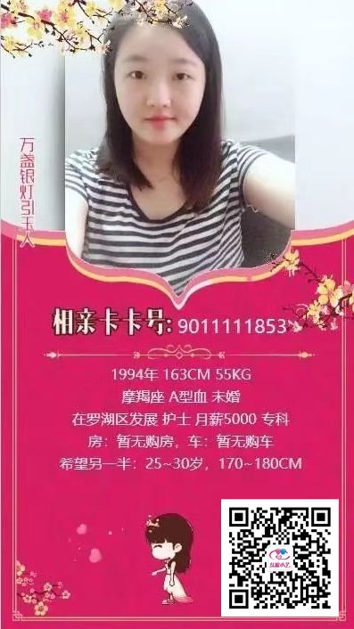户籍:梅州姓名:江MM年龄:26身高:163工作:护士 月薪:5000左右 房车:房车与家人共用 婚姻状况:未婚 自我介绍:本人大专毕业 喜欢有眼缘,上进心,对我好,善于沟通的你 理想另一半:待人处事真诚 有一定的经济条件 93至88年,170以上 对本期嘉宾有意向的可以添加红娘微信