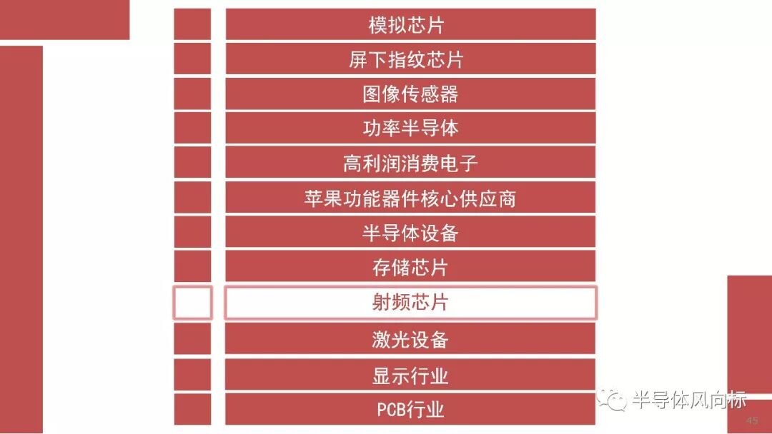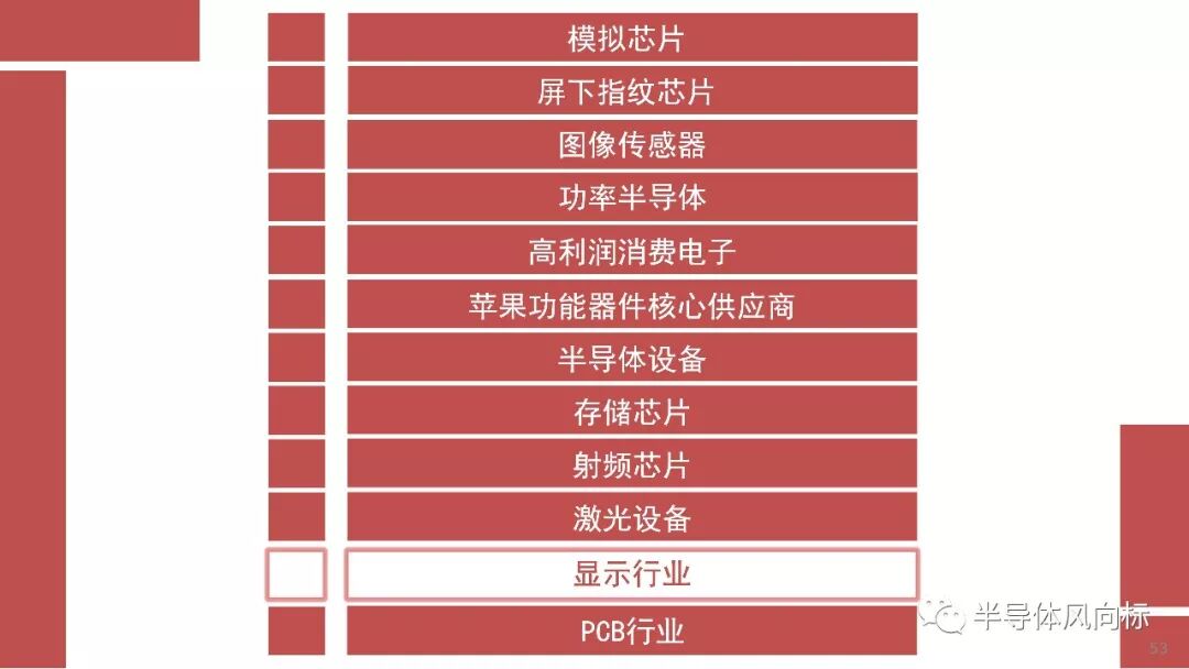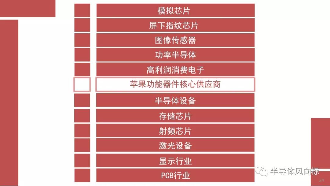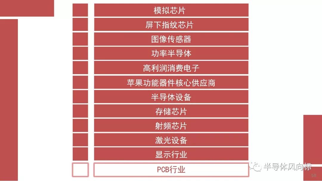 北方华创 l 汇顶科技 l 紫光 l 长电 l 圣邦 l 澜起消费电子 l 四巨头:立讯 l 鹏鼎 l 领益 l 大族国产PCB l 四巨头:深南 l 沪电 l 生益 l 景旺科创板:传音 l 乐鑫 l 光峰 l 华兴 l 安集 l WPS