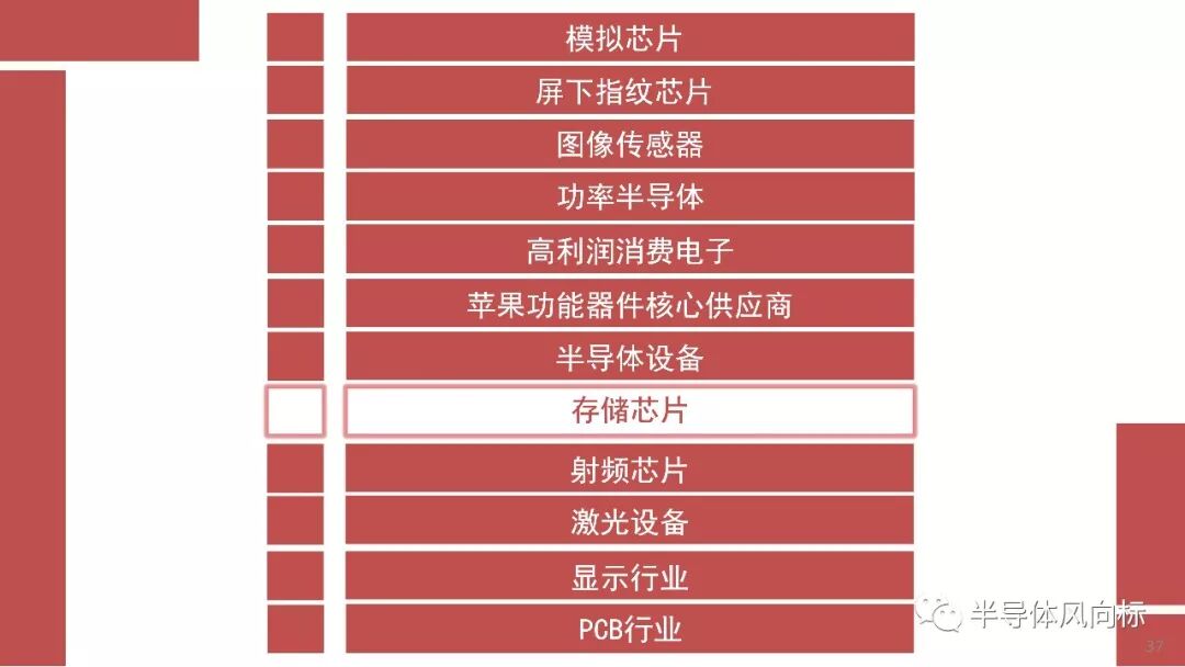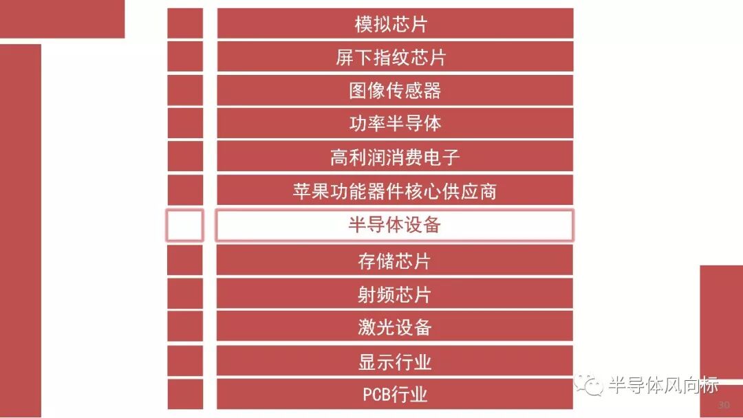 2、中微公司:世界级半导体设备后备军3、大族激光:世界激光设备全场景龙头4、中芯国际:世界第三的芯片先进代工5、兆易创新:世界存储芯片平台后备军6、TCL集团 :世界前四的半导体显示7、长电科技:世界前三的先进芯片封装8、圣邦股份:中国模拟IC芯片设计龙头9、中环股份:世界级大硅片潜力后备军10、紫光国微:世界级卡芯片平台龙头11、卓胜微 :中国射频前端平台级龙头12、北京君正:世界级存储细分后备军
