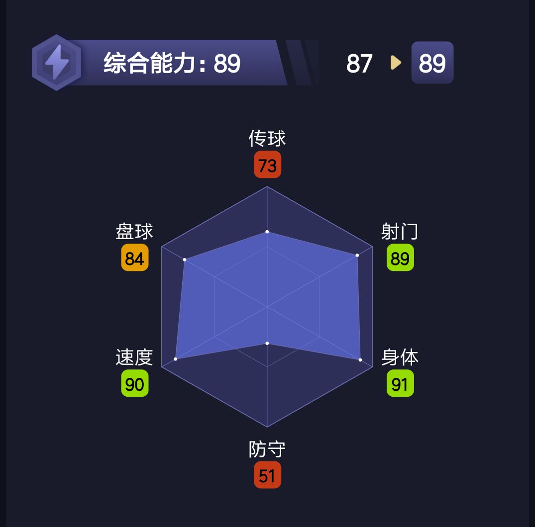 作为一个铜球,总评达到了89,与之对应的则是令人瞠目结舌的91级等级上限。佩莱格里的速度和射门能力十分强悍,188cm的身高还能拥有90的双速,实在难能可贵,而他的缺点也是十分明显,传球能力过低,所以歪哥认为他并不适合作为策应型中锋而存在,如果你是倒三角战术的忠实使用者,可能他并不适合你。