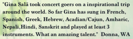 国际瑜伽杂志说:吉娜,这位西方的心灵音乐家,以她如丝绸般润滑甜蜜的声音和心灵完美表达印度灵性音乐的美丽。