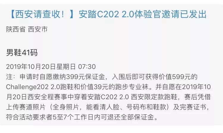 赛前,跑友给我分享了安踏的这个活动,大概意思就是交399报名费可以收到一双鞋,然后只要穿着它跑完西马,上传照片就可以全额退款,我心想还有这等好事,后来和跑友再三确认有没有什么坑,直到他和我强调靠谱,我才将信将疑的交了钱,结果是我通过了审核收到了鞋子,他却没能通过。这款安踏C202 2.0整体感觉比较轻,舒适感十足,确认过脚感,它就是那双在西马赛道带我飞的秘密武器。