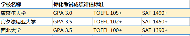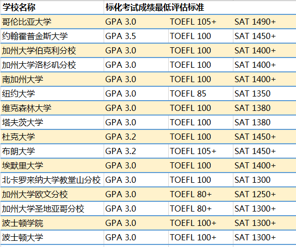 √ 标准化考试成绩(TOEFL\SAT),标化考试成绩评估标准见下表,各项指标要求并非固定,可容许在小范围内浮动。